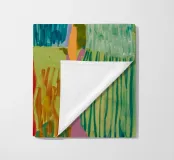 Een abstract kunstwerk dat lijkt op een lappendeken, met verschillende rechthoekige kleurvlakken: blauwe en witte verticale strepen, effen groen en licht geelgroen, mogelijk een gestileerd kustlandschap.