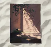 Zonlicht valt door bladeren en werpt zachte schaduwen op een rustieke tafel en stoel in een vredige binnenplaats. Deze serene omgeving nodigt uit tot ontspanning en contemplatie.