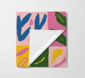 Een speels en energiek patroon van geometrische en organische vormen, gerangschikt in een kleurrijk patchwork- of quiltachtig ontwerp. Het kunstwerk is een vrolijke en levendige viering van kleur en vorm.