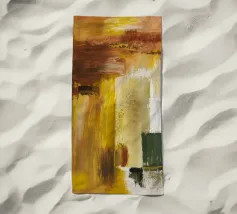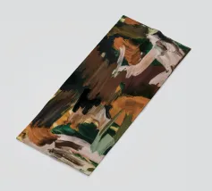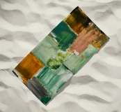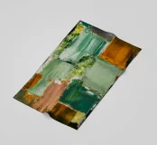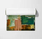 Een abstract kunstwerk met een rustgevende opstelling van vierkante en rechthoekige vlekken in verschillende tinten groen, bruin en beige, die doen denken aan een sereen patchworkveld of een rustig oppervlak met textuur. Bob Nugent-stijl.