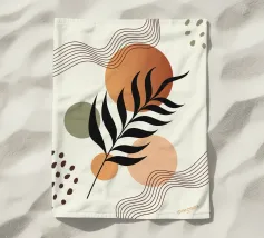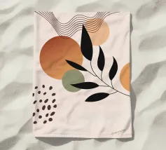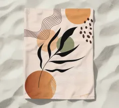 Gestileerde bladeren in zwart en groen tegen een achtergrond van vloeiende, gebogen strepen in zachte aardetinten. Het ontwerp combineert botanische elementen met abstracte geometrische vormen voor een moderne look.