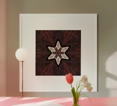 Ster met 5 punten met versierde vormen in groen-geel-blauwe kleuren.