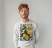 Een levendig stilleven met citroenen en groene bladeren tegen een achtergrond van gedessineerde tegels en abstracte texturen. Fel geel en diep groen contrasteren met de blauwe en witte decoratieve motieven en roepen een mediterrane sfeer op.