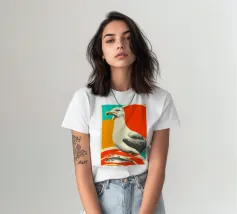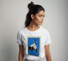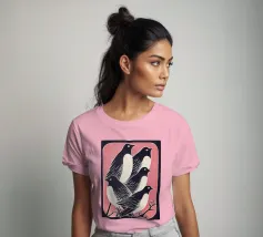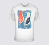 Stijlvolle illustratie van twee meeuwen in een modern volkskunstontwerp tegen een blauwe achtergrond. De elegante kleurencombinatie van koraal, roomwit en marineblauw creëert een harmonieus, maritiem contrast. De vereenvoudigde vormen en decoratieve vleugelpatronen tonen invloeden van Scandinavische en Japanse grafische tradities. De heldere lijnen geven het motief een tijdloze, vriendelijke en optimistische uitstraling. Perfect voor iedereen die partnerschap, evenwicht en natuurlijke eenvoud wil uitstralen.