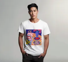Een abstracte compositie toont een schaal aardbeien te midden van een werveling van kleurrijke, organische vormen en patronen, waardoor een frisse en moderne interpretatie van een zomerklassieker ontstaat.