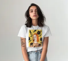A portrait of a woman with flowing red hair, surrounded by stylized leaves and flowers, looking thoughtfully to the side. The style is modern, bold, and slightly art nouveau.