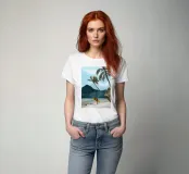 Dit digitale schilderij toont een sereen tropisch strandtafereel waar een vrouwelijke surfer blootsvoets op het witte zand staat met een felgele surfplank in haar hand. Ze kijkt uit over de kalme oceaan, wachtend op de perfecte golf. Torenhoge palmbomen omlijsten de compositie en weelderige, donkergroene bergen rijzen op in de achtergrond onder een gedeeltelijk bewolkte blauwe lucht. Het kunstwerk roept een vredige, avontuurlijke sfeer op, ideaal voor liefhebbers van surfen, reizen en kustlandschappen. De schilderachtige penseelstreken en het zachte kleurenpalet benadrukken de rust en natuurlijke schoonheid van een tropisch paradijs.
