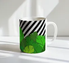 Abstracte geometrische patronen met groene en gele strepen creëren een gevoel van beweging in de compositie. Het ontwerp heeft onregelmatig gevormde verticale elementen die een natuurlijk thema suggereren.