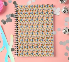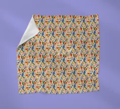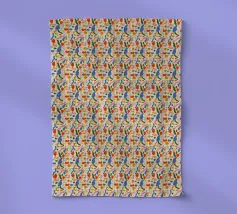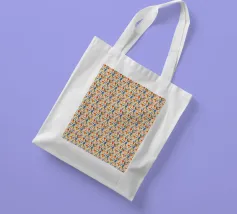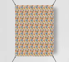 Een levendig en kleurrijk patroon met verschillende vormen in rood, blauw, oranje en groen. Het ontwerp wordt herhaald in een symmetrische opstelling en creëert een opvallend visueel ritme.