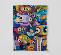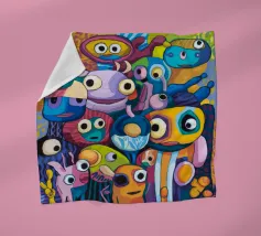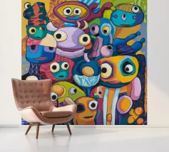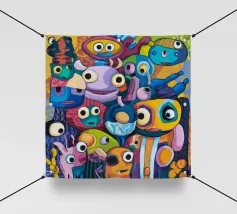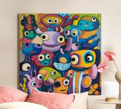 Fantasierijke wezens en fantastische elementen komen samen in een levendige compositie. Dit schilderij nodigt kijkers uit om een magische wereld te verkennen waar creativiteit geen grenzen kent.