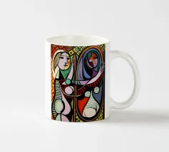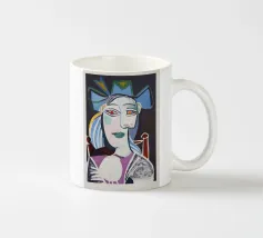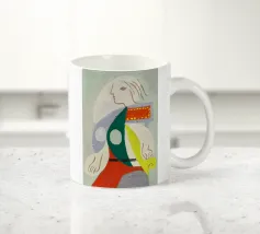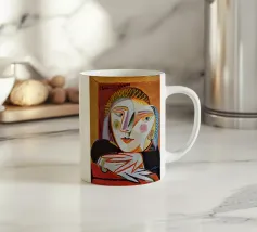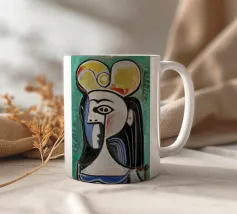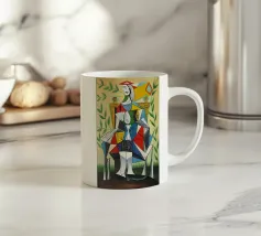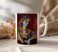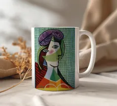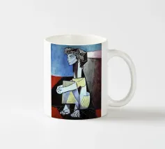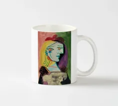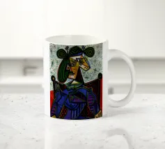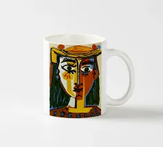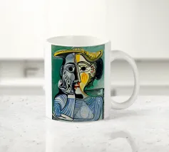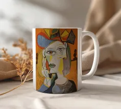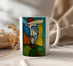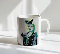 Dompel jezelf onder in de complexe schoonheid van deze digitale poster, een levendig eerbetoon aan de kubistische meesterwerken van Picasso. Het kunstwerk toont een zittende vrouw, getooid met een opvallende gestreepte hoed, weergegeven met gefragmenteerde gelaatstrekken en meerdere perspectieven. Haar blauwe huid contrasteert met het warme geel, rood en paars van haar kleding met patroon en de achtergrond, waardoor een visueel rijk tapijt ontstaat. Deze eersteklas digitale poster, met 7000x5000 pixels op 300 dpi, legt de ingewikkelde details en baanbrekende stijl onberispelijk vast, waardoor het een buitengewoon middelpunt is voor elke moderne kunstcollectie.