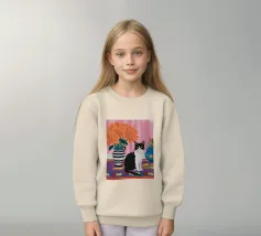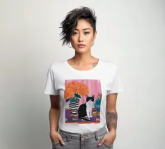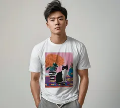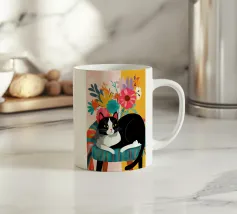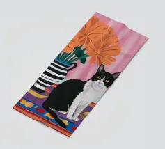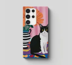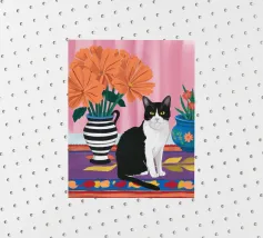 Een zwart-witte kat zit vorstelijk achter een grote vaas bloemen met gedurfde, gestreepte patronen tegen een roze gordijn, waardoor een opvallend en charmant stilleven ontstaat.