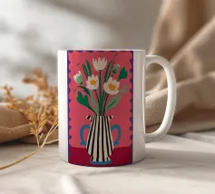 Een gestreepte witte en blauwe vaas bevat gele en roze bloemen tegen een levendige, quiltachtige achtergrond van roze, oranje en rode bloemmotieven.