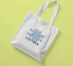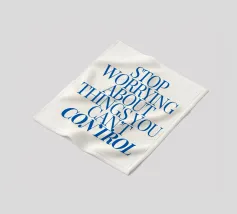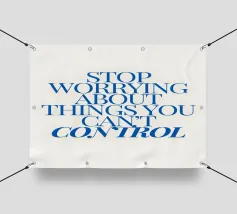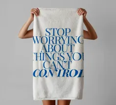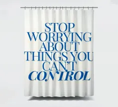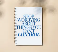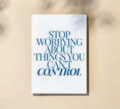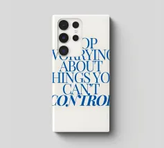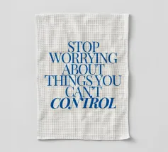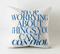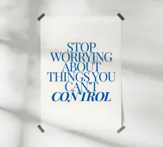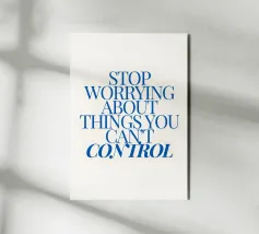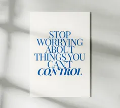 Een motiverende quote in vette blauwe tekst op een crèmekleurige achtergrond met de tekst: "Stop met je zorgen te maken over dingen waar je geen controle over hebt".