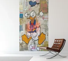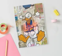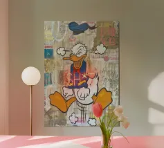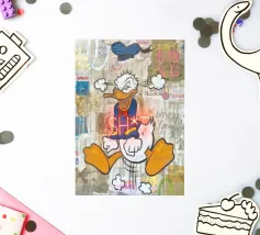 Het kunstwerk met de titel "I Don't a Duck" heeft een surrealistische en absurde humoristische uitstraling die woordspelingen combineert met visuele elementen. Met een minimalistische illustratiestijl en ironische ontwerpbenadering straalt het werk een gevoel van verwarring uit. De zin "stressed duckk" zelf staat centraal, wat een ontkenning of drogredenering van het bestaan van een eend impliceert, wat betekenislagen toevoegt en tegelijkertijd uitnodigt tot lachen. Deze stijl past bij de digitale trends van absurdisme, meme-cultuur en experimenteel design die de spot drijven met alledaagse logica in unieke en fantasierijke visuele vormen.