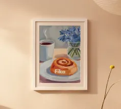 Verschillende koffiekopjes zijn speels op elkaar gestapeld en vormen een harmonieus, minimalistisch motief. Het Zweedse opschrift "en kopp kaffe, tack" ("een kopje koffie, graag") verschijnt ook. De combinatie is warm, uitnodigend en typisch Scandinavisch.