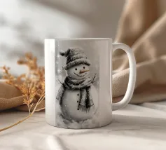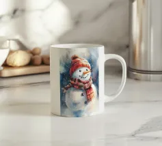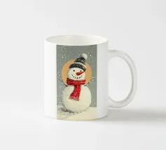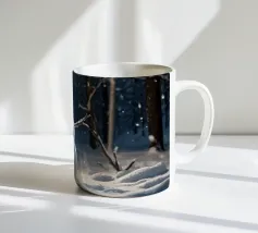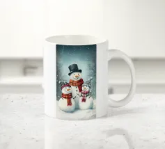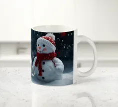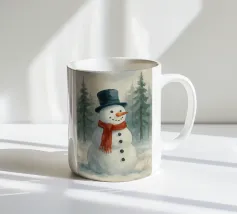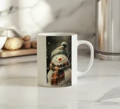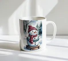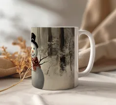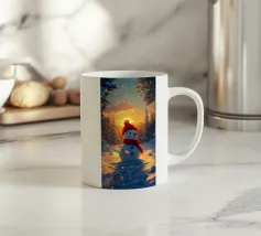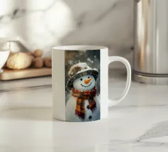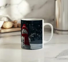 Een sneeuwpop getooid met een gezellige gebreide muts en sjaal geniet van de serene schoonheid van een besneeuwd bos onder de gloed van maanlicht, omringd door vallende sneeuwvlokken.