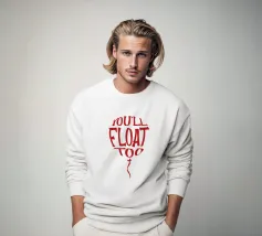 Een rode ballonvorm met de ijzingwekkende zin "You'll float too" . De gestileerde tekst bootst de vorm van de ballon na, wat de griezelige sfeer versterkt.