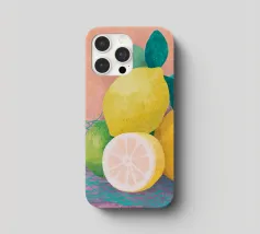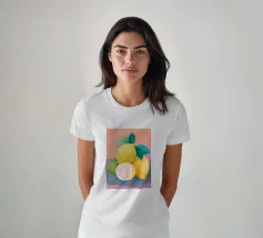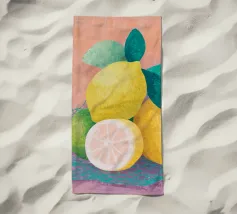 Een mediterraan stilleven met citroenen en bladgroen in zachte pastelkleuren wordt gepresenteerd in een grafisch ruitpatroon. Deze op vintage geïnspireerde illustratie brengt een tropische zomerflair in elke keuken en viert de versheid van biologisch fruit en groenten.
