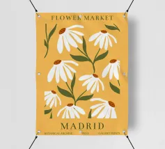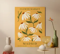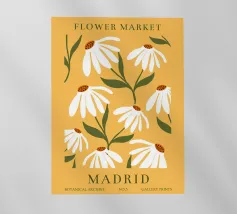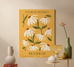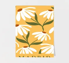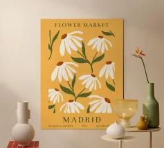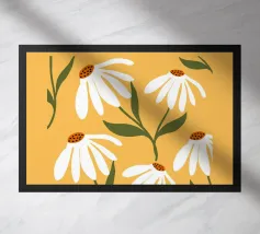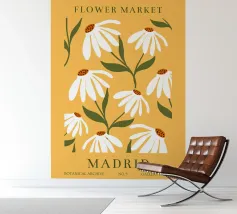 Dit vrolijke margrietmotief heeft witte bloemen en levendige groene stelen op een warme, mosterdgele achtergrond. Dit bloemenmotief is geïnspireerd op botanische kunst en vintage esthetiek en geeft je huis een tijdloze en stijlvolle charme. Als muurschildering, kussen, mok of hoesje voor je mobiele telefoon - dit motief is een veelzijdige blikvanger voor de woonkamer, slaapkamer of kantoor. Ideaal voor liefhebbers van mid-century decoratie, Scandinavische stijl en florale kunstwerken. Een modern hoogtepunt dat met zijn frisse look elke kamer verlevendigt en inspireert.