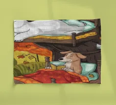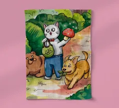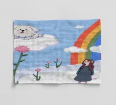 Dit kunstwerk toont een chagrijnige wolk met een gedachtewolkje met daarin een vogel en een beer. Het humoristische en fantasierijke tafereel speelt zich af tegen een zachtblauwe achtergrond.
