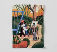 Dit kunstwerk toont een chagrijnige wolk met een gedachtewolkje met daarin een vogel en een beer. Het humoristische en fantasierijke tafereel speelt zich af tegen een zachtblauwe achtergrond.