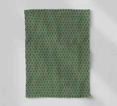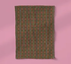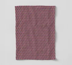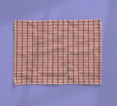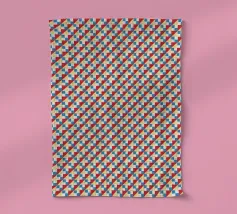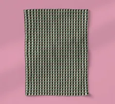 Een complex patroon van in elkaar grijpende vormen in rood, groenblauw en wit creëert een rasterachtige optische illusie. Het repetitieve geometrische ontwerp voegt een gevoel van beweging en diepte toe.