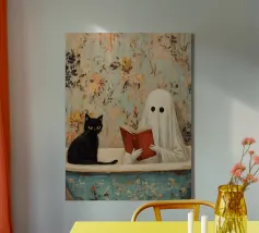 Olieverfschilderij van een schattig spookje in bubbelbad met bubbels en bloemen