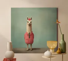 Een witte lama met zwarte oren en neus draagt een kleurrijk gestreepte sjaal in rood, oranje, geel en turquoise. Met een lichte glimlach en gesloten ogen staat hij op een gestructureerde oranje ondergrond voor een gedeelde geel-turquoise achtergrond - charmant en speels.