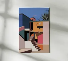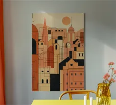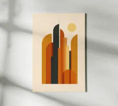 Gestileerd stadsgezicht in een vlakke, abstracte weergave, gekenmerkt door geometrische vormen en gedurfde grafische elementen. De minimalistische compositie maakt gebruik van gedempte tinten grijs, oranje, beige en blauw en combineert kubistische invloeden met strakke lijnen en symmetrische patronen tegen een witte achtergrond, waardoor een elegant en modern ontwerp ontstaat. Elementen werden gerealiseerd op basis van schetsen in Adobe Illustrator en vervolgens gecombineerd in Photoshop.