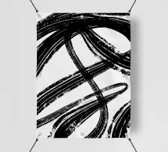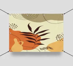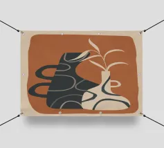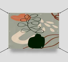 Abstracte lijnen en blokken van gedempte kleuren creëren een moderne compositie met een minimalistische esthetiek. Een gestileerde plantvorm en een eenvoudige vaasvorm voegen organische elementen toe, afgezet tegen geometrische vormen.