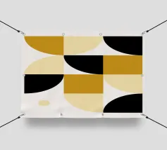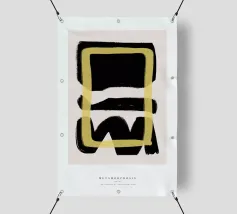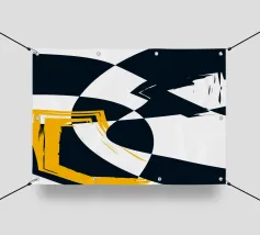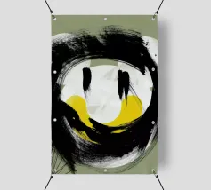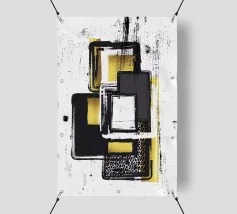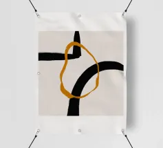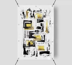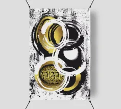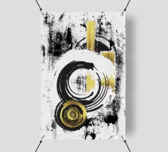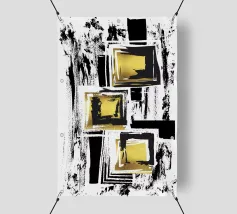 Gedurfde zwarte rondingen verstrengelen zich met een levendig gouden vierkant in het midden, waardoor een dynamische en abstracte compositie ontstaat. Het samenspel van donkere en lichte contrasten voegt diepte en beweging toe aan het ontwerp.