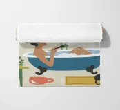 Deze afbeelding toont een persoon die een bad neemt in een bad omringd door planten en een kat, met een kopje en een boek in de buurt. De gezellige en rustige sfeer maakt het een troostende en aangename scène.