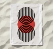 A bold Bauhaus-inspired abstract design featuring layered red circles and rhythmic black vertical lines. A striking modern statement piece perfect for contemporary interiors.