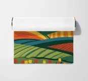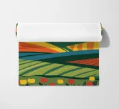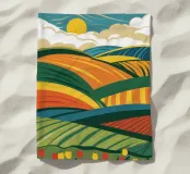 Een levendig landschap van overvloedige, glooiende velden met gewassen onder een zonnige hemel met pluizige wolken. De gestileerde, kleurrijke weergave van het platteland viert de schoonheid en overvloed van landbouwgrond.