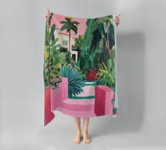 An elegant, tranquil scene featuring pink architectural elements, a patterned pathway, and lush green palm leaves, suggesting a modern and chic tropical resort.