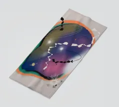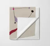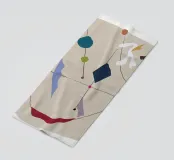 Abstracte vormen in gedempte kleuren worden onderling verbonden door dunne zwarte lijnen, waardoor een dynamische compositie ontstaat. Het ontwerp bevat verschillende geometrische en organische vormen die een gevoel van evenwicht en beweging toevoegen.