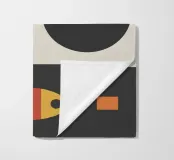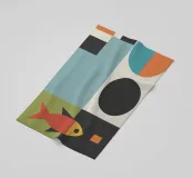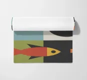 Een geometrische compositie toont een gestileerde oranje vis tegen een achtergrond van gekleurde rechthoeken en cirkels, een mix van groenblauwe, zwarte en groene tinten. Gewaagde vormen en contrasterende kleuren creëren een moderne, abstracte esthetiek.