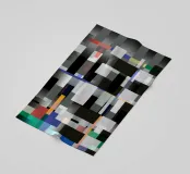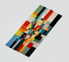 Een geometrische opstelling van gekleurde rechthoeken en vierkanten creëert een levendig abstract patroon. Het ontwerp maakt gebruik van een grijstinten achtergrond met knallen van oranje, blauw en groen, waardoor een visueel dynamische compositie ontstaat.