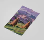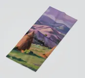 A serene landscape centered on a well-formed haystack standing in a field characterized by gently rolling hills in muted shades of purple and green, all under a soft, calm sky.