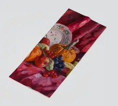 Een stilleven of oogsttafereel met een grote oranje pompoen of pompoen, rode chilipepers en groene bladeren, mogelijk aan de wijnstok. De achtergrond is een mix van warme en koele tinten.