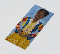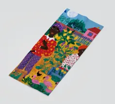 Dit kunstwerk toont een persoon die op een gestreepte stoel zit, omringd door zonnebloemen en een groene tas. De achtergrond is gedempt bruin en creëert een rustieke en reflecterende sfeer.