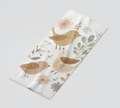 Een rustig tafereel van drie mussen op takken met eenvoudige bladeren.