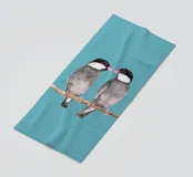 A watercolor drawing of two Java sparrows. They sit next to each other on a long stick and touch each other with the tips of their beaks.