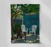 Twee witte adirondackstoelen staan in een zonnige tuin en werpen lange, donkere schaduwen. De compositie is een eenvoudige maar krachtige studie van de zomer, ontspanning, licht en schaduw.