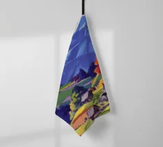 Een kleurrijk landschapsschilderij toont een dorp genesteld op een heuvel met levendige, patchwork-achtige velden in groene, blauwe en paarse tinten, met roodgedekte huizen onder een heldere hemel.