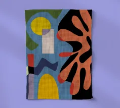 Een kubistisch geïnspireerd abstract kunstwerk deconstrueert een menselijk gezicht in geometrische vormen, ogen en kleurblokken, waardoor een uitdagend en dynamisch werk ontstaat over perceptie en identiteit.