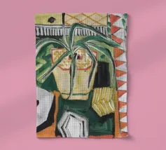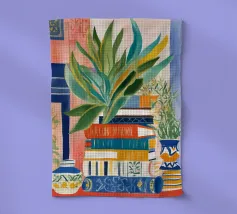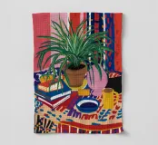 Een stilleven van een potplant en andere objecten op een tafel met een kleurrijk, gedessineerd tapijt eronder. De compositie tegen een roze muur is modern, eclectisch en zit vol charmante, decoratieve details.