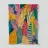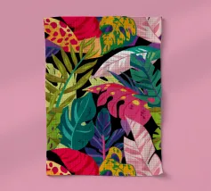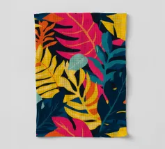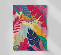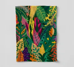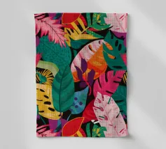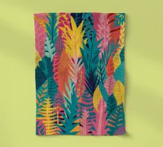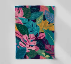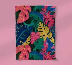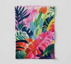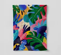 A dense, colorful pattern of overlapping tropical leaves and abstract shapes in bright hues of yellow, pink, blue, and green, creating a joyful, energetic design.
