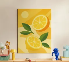 Een grafisch patroon in pop-artstijl van sinaasappelschijfjes tegen een donkerblauwe achtergrond. De compositie is modern, levendig en een fris, pittig en stijlvol ontwerp.